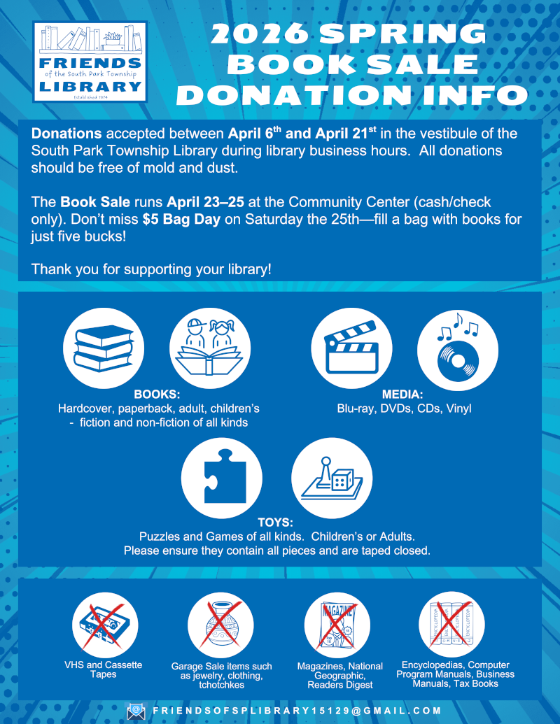© 2026 South Park Township Library, 2575 Brownsville Road, South Park, PA 15129 | 412-833-5585 | southpark@einetwork.net