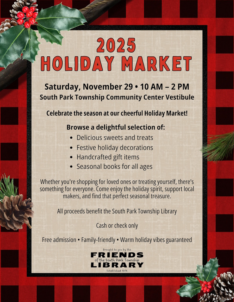 Cash or check only! All proceeds benefit the South Park Township Library. Free admission • Family-friendly • Warm holiday vibes guaranteed