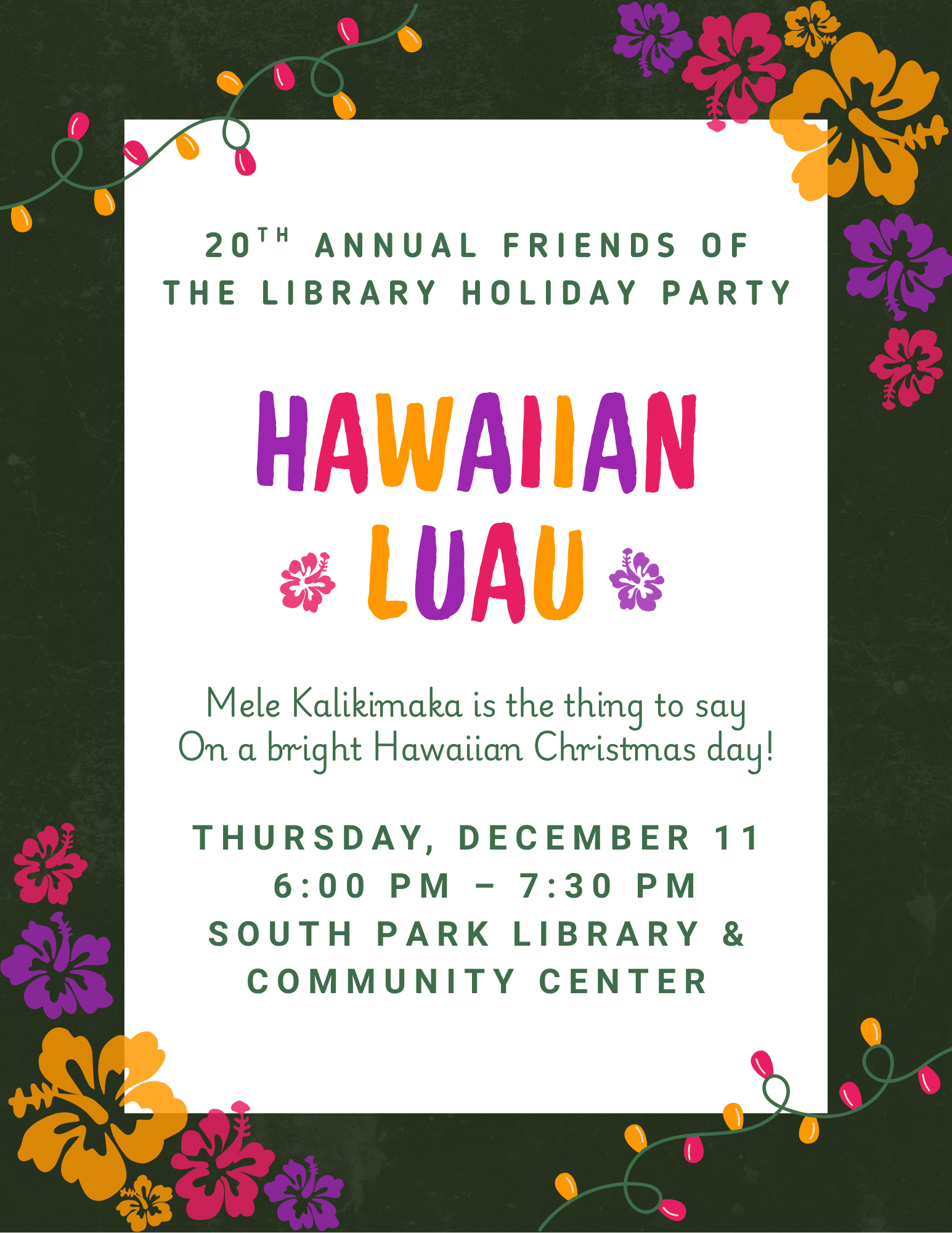 "Mele Kalikimaka is the thing to say on a bright Hawaiian Christmas day!" All are welcome to join us at the 20th Annual Friends of the South Park Library Holiday Party on Thursday, December 11th from 6:00 pm - 7:30 pm!