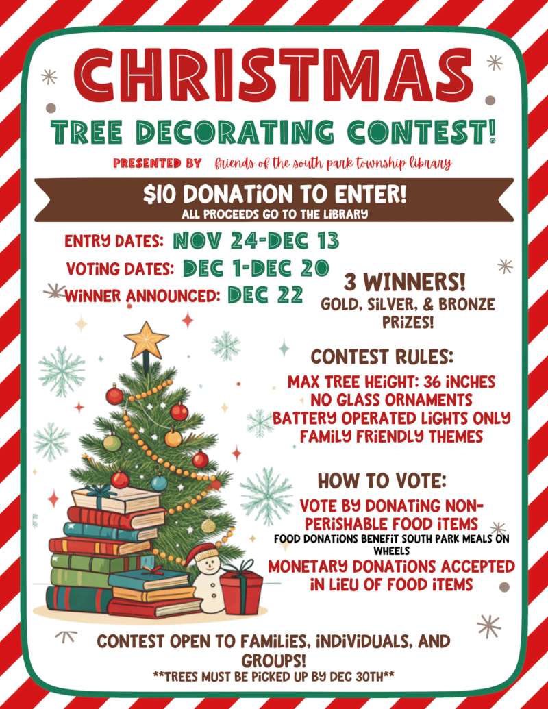 WANT TO ENTER?: Entry fee is $10 with all proceeds going to the South Park Township Library! Bring your decorated tree and share your holiday spirit with the community!
