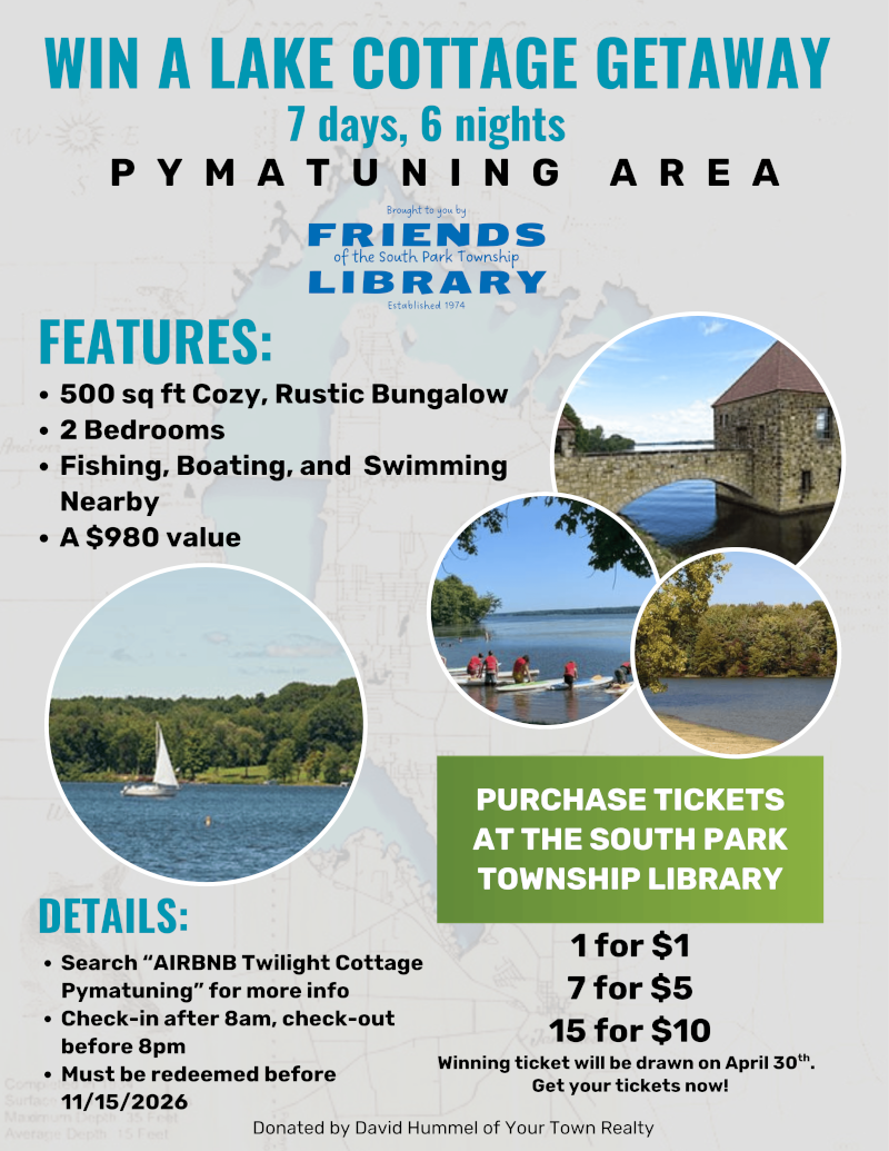 Dreaming of summer? One lucky winner will enjoy 7 days and 6 nights at a cozy two‑bedroom cottage near beautiful Pymatuning Lake — a $980 value! Think fishing, boating, swimming, wildlife watching, lakeside picnics, and crisp fall evenings by the fire - all for the price of a raffle ticket. Raffle tickets are available at the South Park Township Library: 1 for $1, 7 for $5, 15 for $10. Search “Airbnb Twilight Cottage Pymatuning” to see this relaxing retreat for yourself. The Friends of the South Park Township Library will select the lucky winner on April 30, 2026. The stay must be used by November 15, 2026. All proceeds benefit South Park Township Library!
