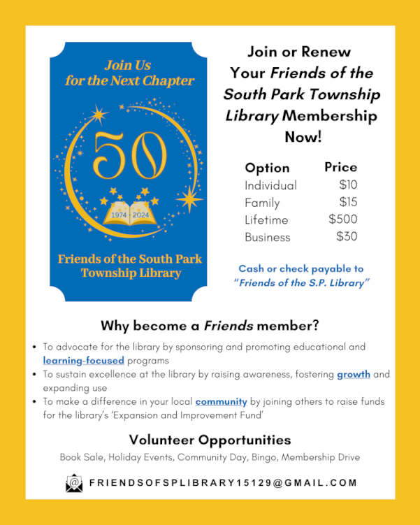 The Friends of the South Park Township Library are inviting all residents and businesses of the Township to join the already existing Friends of the Library membership.